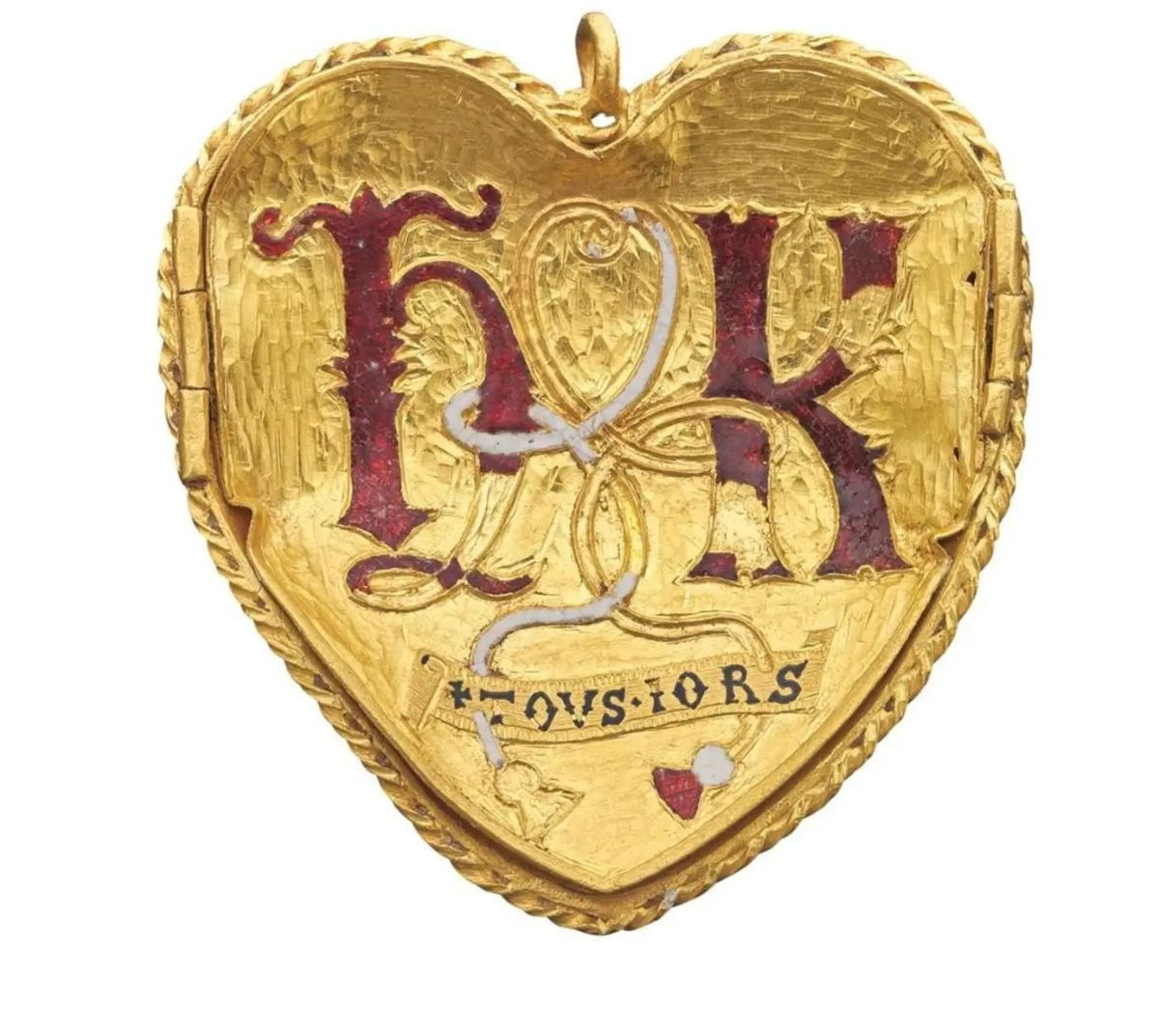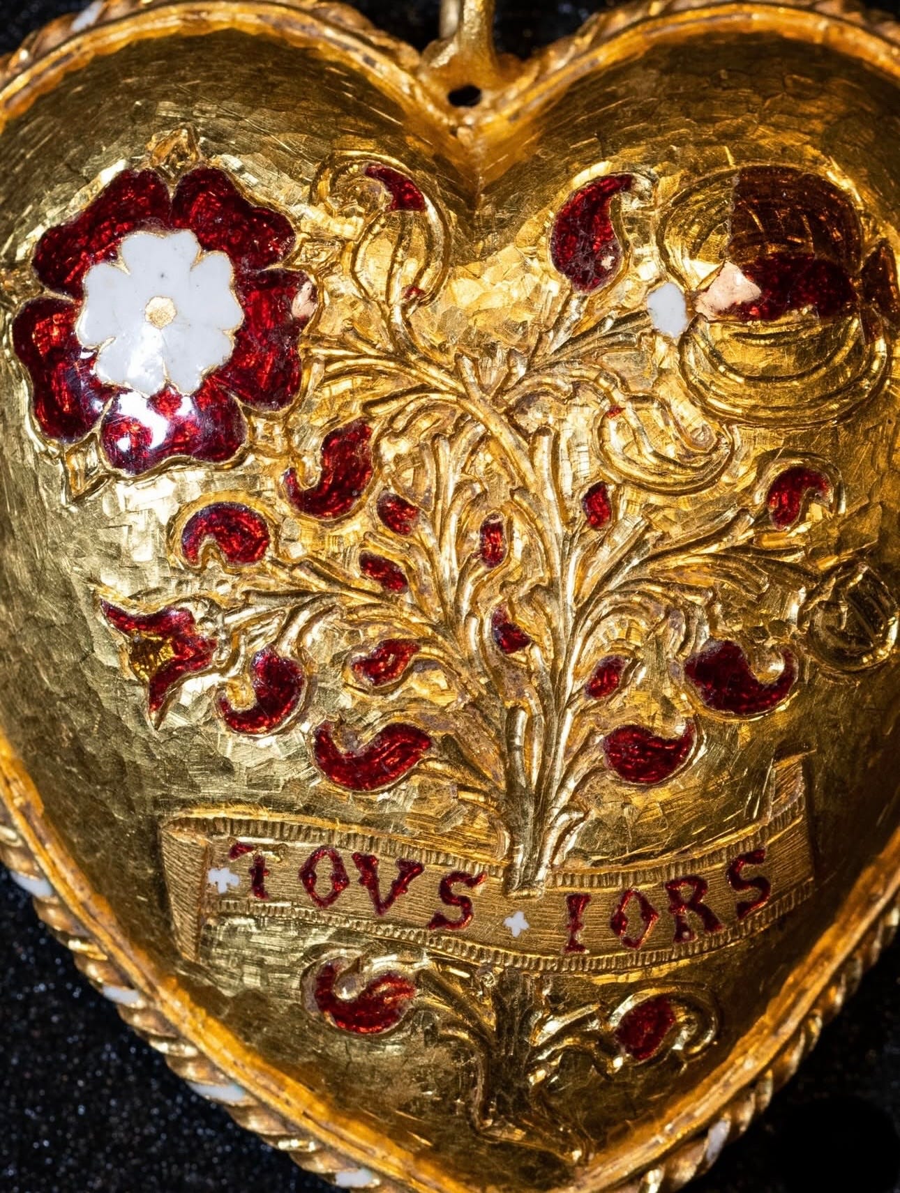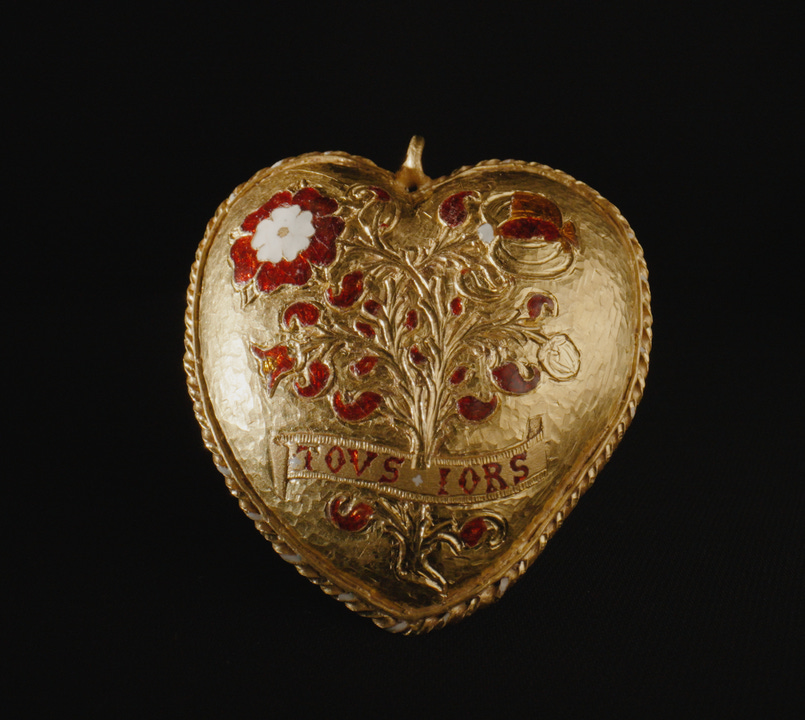 Le ipotesi 1 - Un gioiello di corte. È poco probabile che fosse un dono privato tra i sovrani: forse si trattava di un gioiello da cerimonia destinato a un membro della corte, offerto dal re o dalla regina in occasione celebrazioni ufficiali. 2 - Il premio per un torneo. Enrico VIII era un grande appassionato di giostre e tornei e un'attenta analisi della sua iconografia e di altri documenti fa pensare che possa essere stato commissionato per essere indossato o addirittura donato in un'occasione del genere. Forse all'epoca del famoso Campo del Drappo d'Oro; durante l'incontro del re d'Inghilterra con il re di Francia, avvenuto nel 1520, erano state infatti organizzate diverse competizioni. Sebbene le sue dimensioni suggeriscano che fosse adatto solo a una donna, potrebbe non essere stato concepito per essere indossato. 3 - Un pegno di fidanzamento. Nell’ottobre 1518 si celebra il fidanzamento tra la principessa Maria, figlia di Enrico e Caterina, e il Delfino figlio di Francesco I e Claudia di Francia. I promessi sposi all'epoca hanno rispettivamente due anni e otto mesi, ma l'impegno era preso seriamente quindi la corte organizzava tornei e feste spettacolari, per cui venivano commissionati gioielli scenografici e simbolici. Come è finito nel Warwickshire un gioiello della corte dei Tudor? Questo è un altro mistero. Com’è fatto Il Cuore Tudor ha una fattura raffinata, è in oro 24 carati ed è composto da tre elementi: una catena d’oro di 75 maglie, una chiusura smaltata a forma di mano e un pendente apribile. Sulla parte anteriore ci sono la rosa Tudor, emblema di Enrico VIII, e il melograno, simbolo personale di Caterina d’Aragona che richiama fertilità e prosperità. In basso si legge “TOVS IORS”, forma arcaica del francese toujours “sempre”, ma che potrebbe significare anche “tutto tuo”. Sul retro del pendente sono incise le iniziali dei sovrani, “H” e “K” accompagnate dallo stesso motto. La chiusura ha la forma di mano tra le nuvole, simbolo nel Cinquecento sia della protezione divina sia dell’amore.