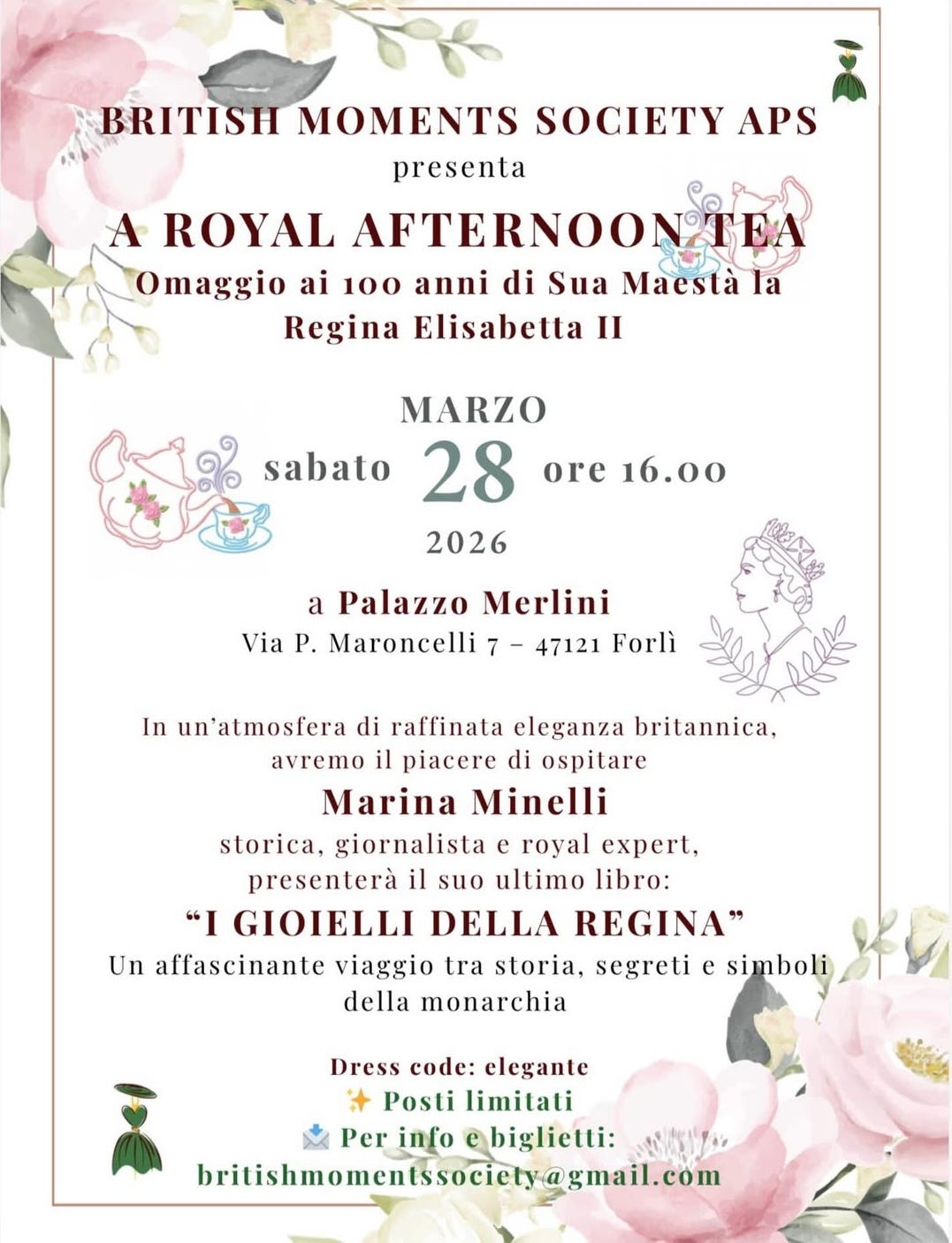 Sabato 28 marzo sarò ospite a Forlì della British Moments Society per il loro Royal Afternoon Tea dedicato ai 100 anni di Elisabetta II.